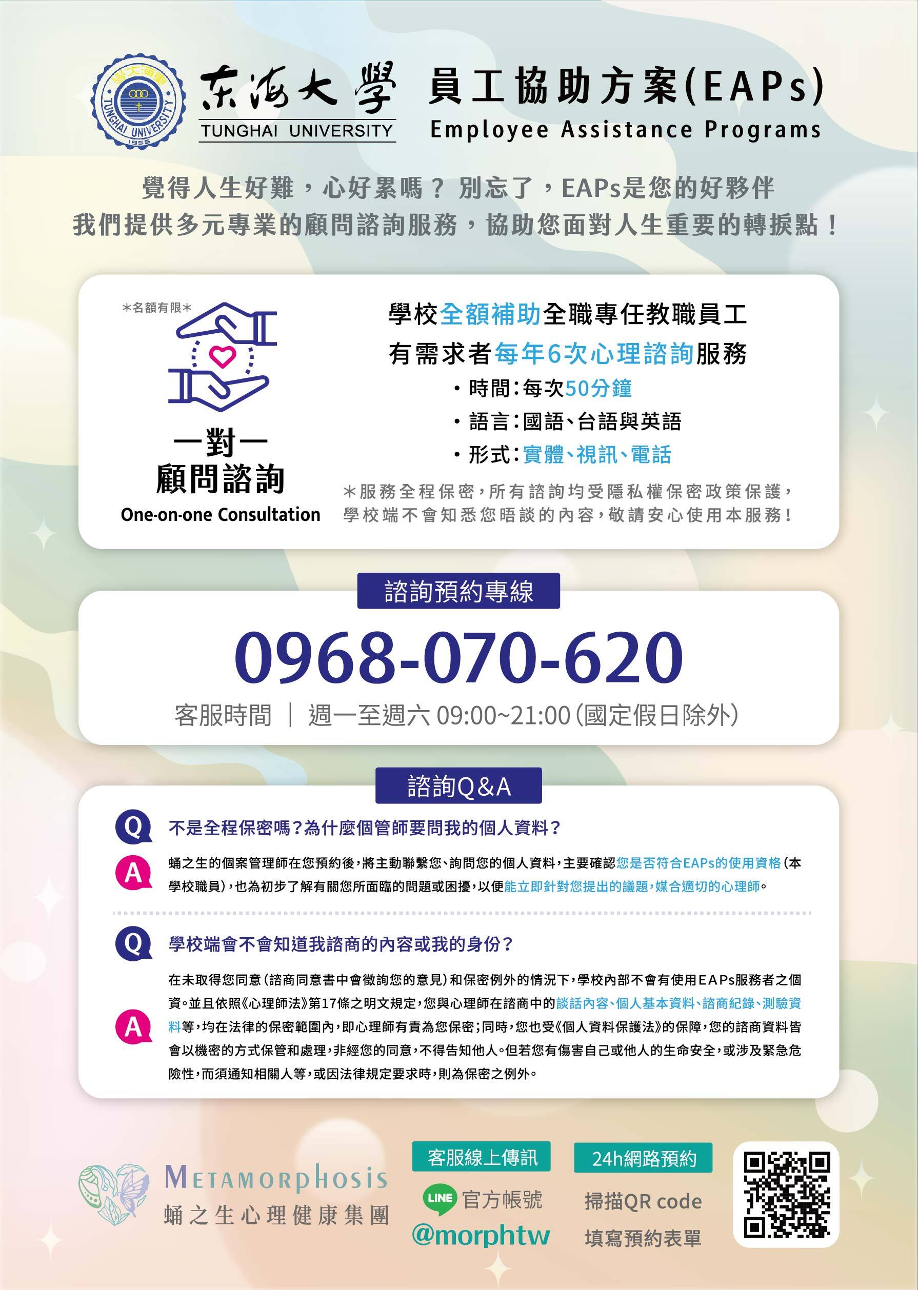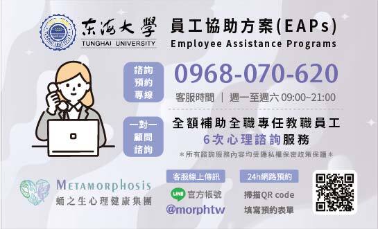 主旨:本校與依取有限公司(蛹之生心理諮商所)合作簽訂「東海大學113學年度員工協助方案」,服務對象為本校全職專任教職員工(含約聘人員、計畫人員、專案人員),詳如說明及附件,請查照轉知所屬全職同仁。
